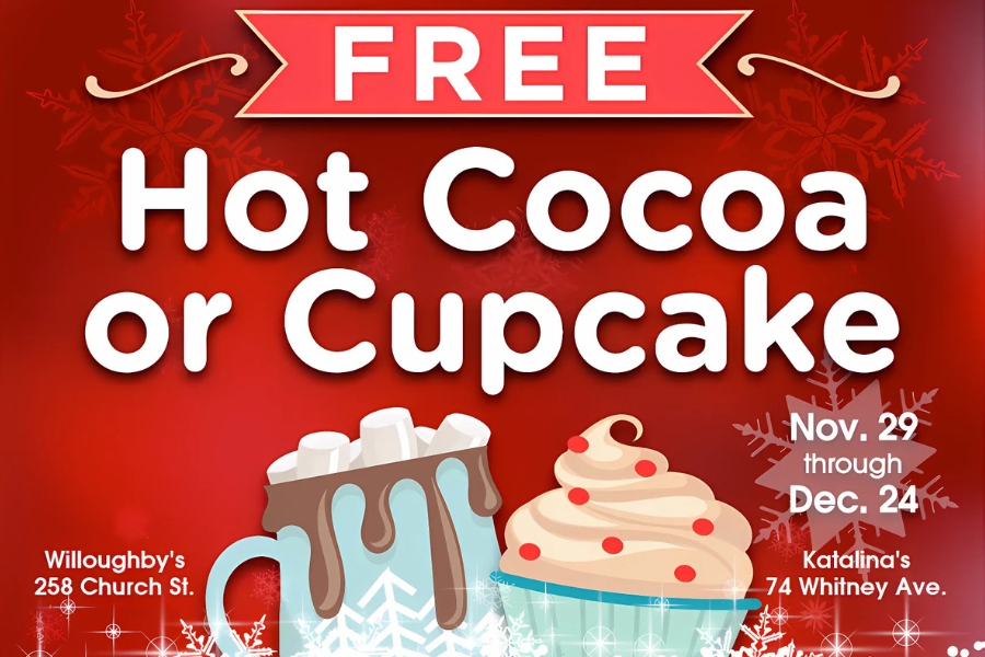 Spend $25 or more at one of the participating retailers in the Whitney-Audubon District listed below and receive a free regular hot cocoa at Willoughby’s Coffee & Tea, 258 Church Street or cupcake from Katalina’s Bakery, 74 Whitney Avenue. Offer valid from November 28 and ends on the earlier of (i) December 24, 2025, (ii) the date this offer is cancelled. Limit 1 per household, per day, with same-day paper receipt from a participating merchant. Offer may be cancelled and end at any time. Participating merchants in the Whitney-Audubon District are limited to the following: